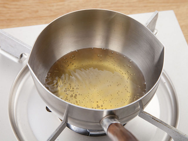 全体的にポコポコ泡立つ沸騰状態ではふきこぼれることもあるので、沸騰直前で火を止めてね!沸騰直前とは、湯気が出てきて、お鍋のふちや底に小さな泡が出ている写真のような状態のことです。火を使うときは、やけどをしないように注意してくださいね!