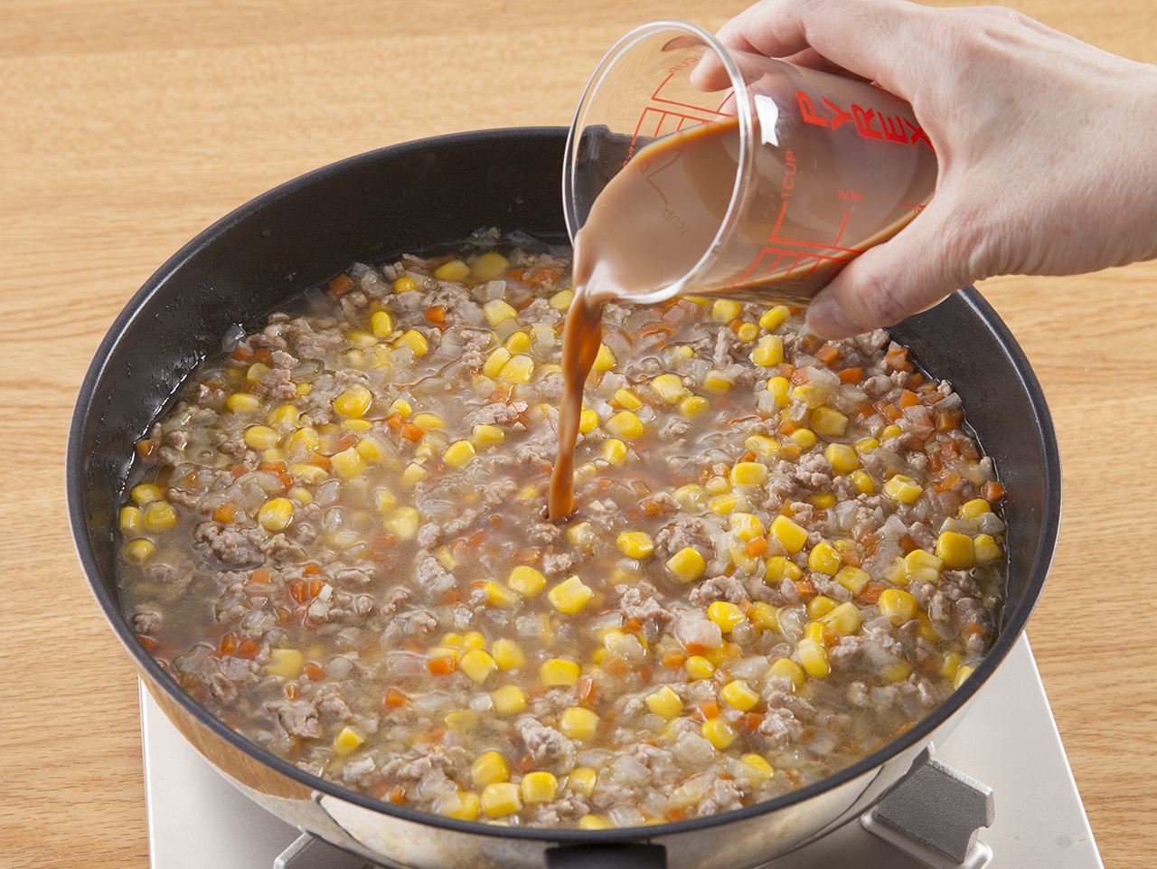 いったん火を止め、コーン、残りの「キリン 午後の紅茶 エスプレッソティー」を加え、カレールウを割り入れて溶かし、とろみが出るまで弱火で約2~3分煮ます。お米をといでザルに上げ、しっかりと水気をきることで、水加減が正確になります。ザル上げの時間が長すぎると、お米が乾燥してしまうので気をつけてくださいね。布巾などをかけておきましょう。火を使うときは、やけどをしないように注意してくださいね!包丁を使うときは手を切らないように、気をつけて~!