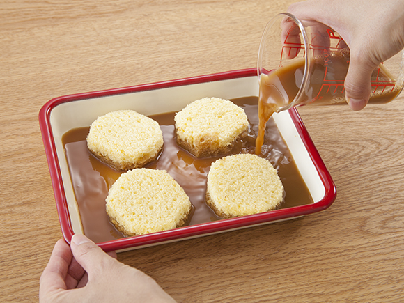 クリームチーズは室温に戻します。カステラは厚さ1cmに切り、器の大きさに合わせて切りそろえ、バットに並べ、「キリン ファイア 挽きたて微糖」をかけて、浸します。